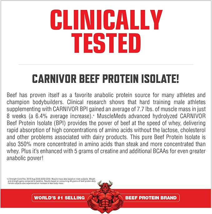 Aislamiento de proteína de vaca: La carne de res ha demostrado ser una proteína anabólica durante siglos de uso. Ahora, MuscleMeds proporciona a los culturistas un aislado de proteína de carne de res pura que ha sido clínicamente probado para desarrollar músculo. MuscleMeds CARNIVOR BPI está un 350% más concentrado en aminoácidos que el bistec y más concentrado que el suero de leche, sin grasa ni colesterol, y sin gelatina ni colágeno. Además, CARNIVOR MASS BIG STEER 1250 está fortificado con BCAA para poder anabólico adicional.