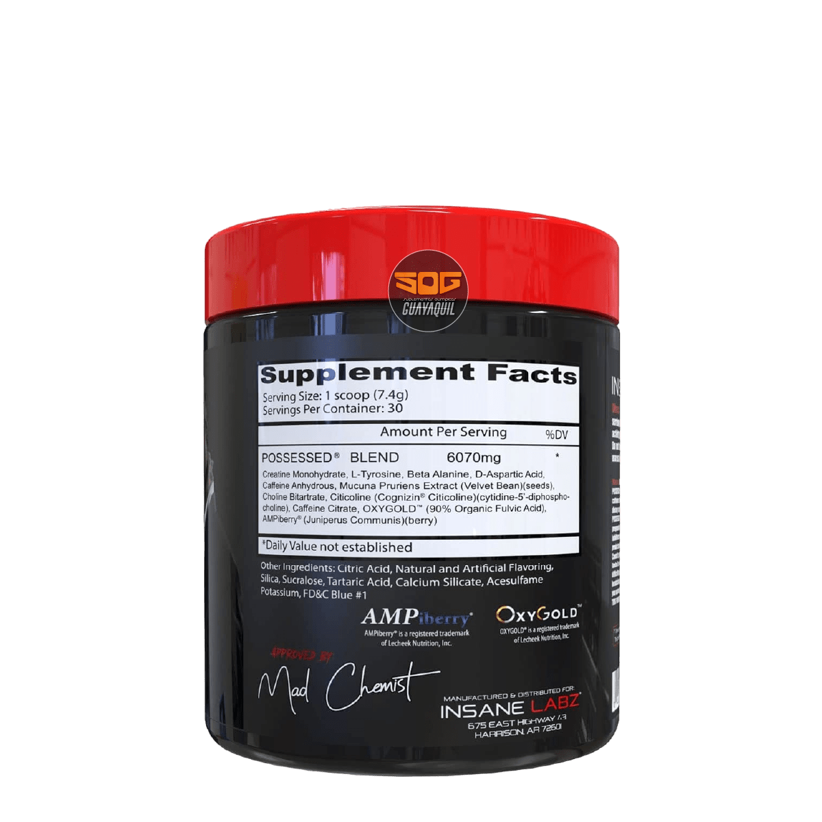 - Insane Labz Possessed es uno de los pre-entrenamientos más exclusivos del mercado. Con una dosis completa de creatina para aumentar la fuerza y la resistencia junto con Mucuna Pruriens y ácido D-aspártico para aumentar los niveles de testosterona que ayudan a desarrollar masa muscular y fuerza, Possessed marca todas las casillas que no sabías que necesitabas en un pre-entrenamiento .